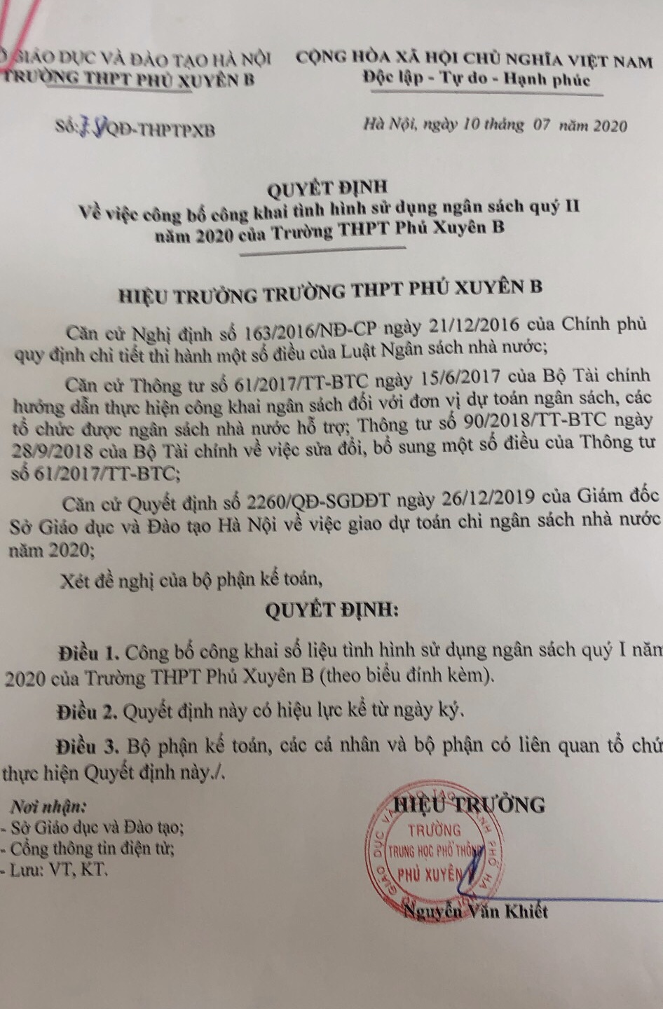 Công bố công khai tình hình sử dụng ngân sách Quý II năm 2020