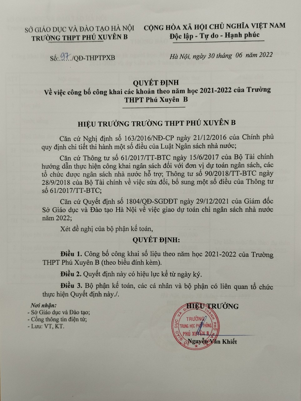 Công khai theo năm học 2021- 2022 theo Quyết định số 97