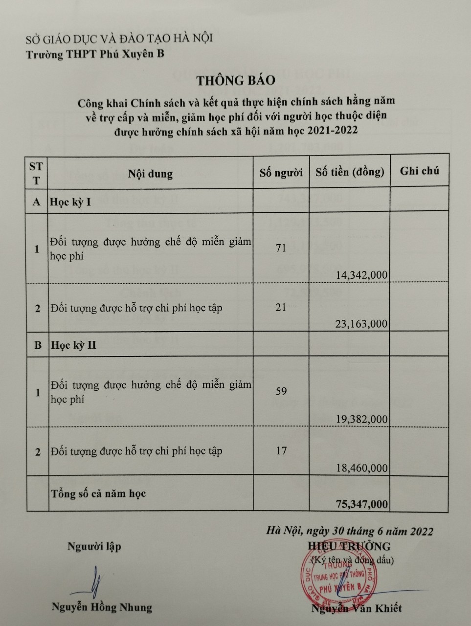 Công khai các khoản thu, hỗ trợ học sinh, học phí năm học 2021 - 2022