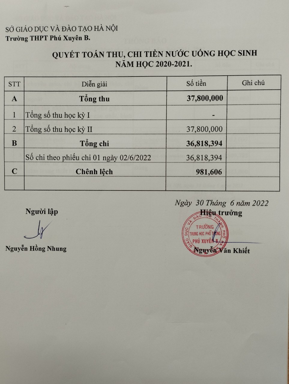 - Quyết toán thu chi tiền nước uống học sinh năm học 2021- 2022