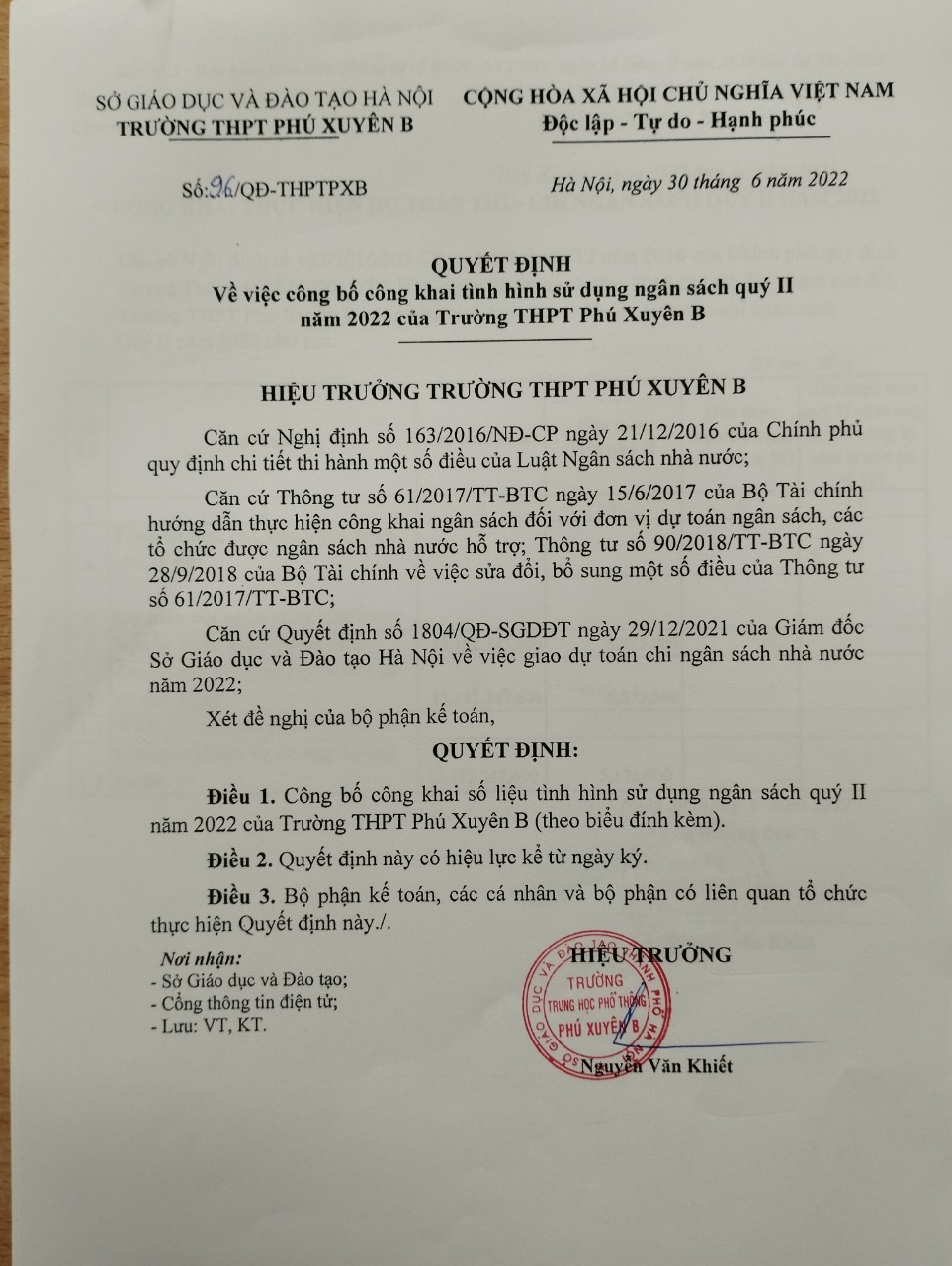 Công khai quyết định 96 quyết toán thu chi quý 2 / 2022