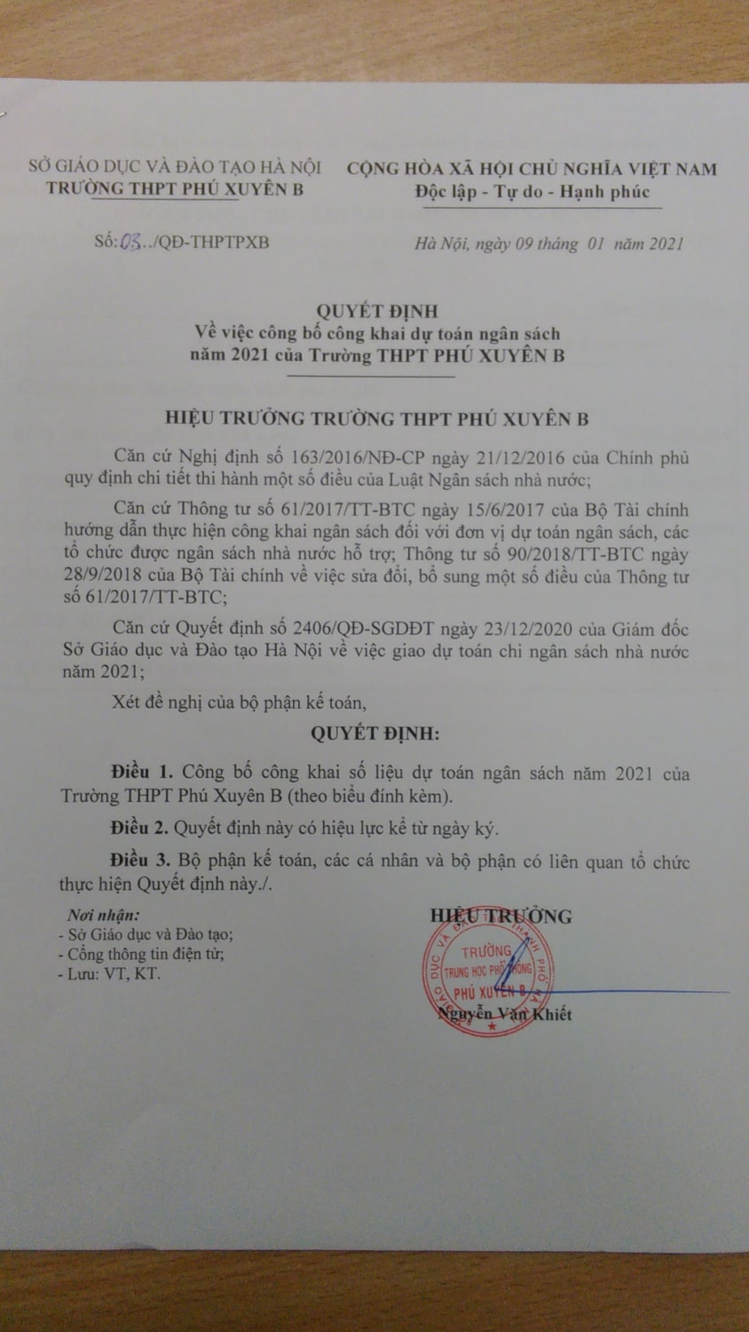Công khai quyết định giao dự toán đầu năm 2021  và quyết định công khai tình hình sử dung ngân sách quý 4 năm 2020