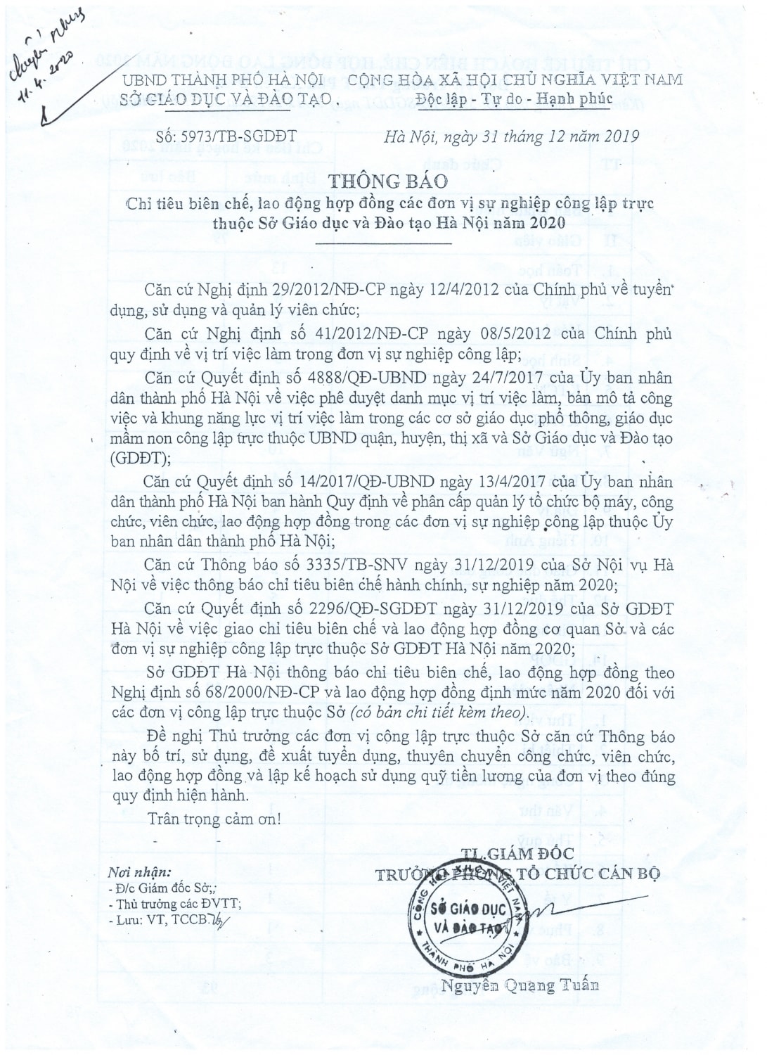 Thông báo chỉ tiêu biên chế, lao động hợp đồng năm 2020