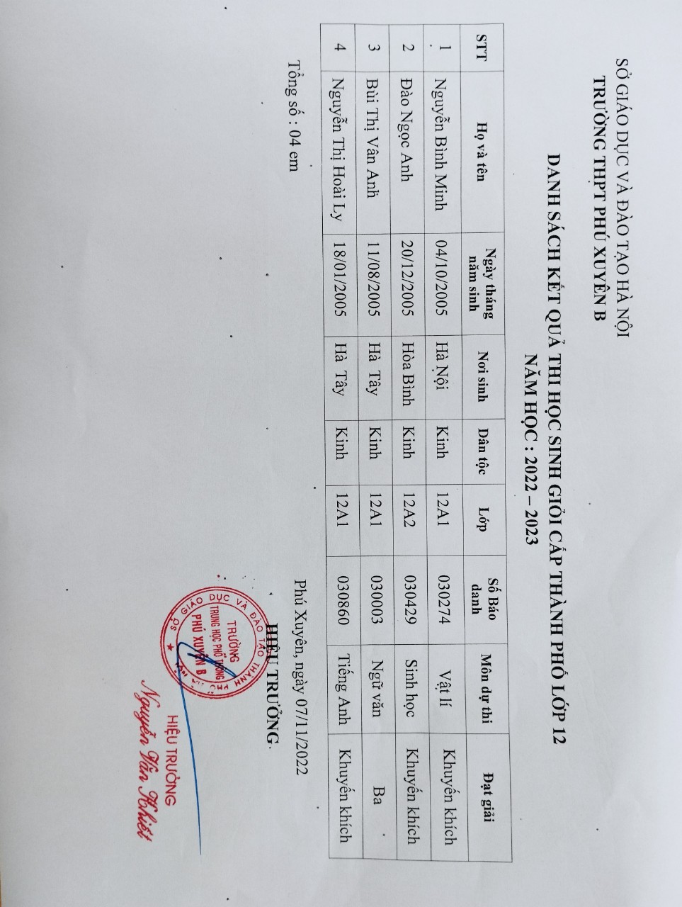 danh sách học sinh đạt giải thi học sinh giỏi lớp 12 năm học 2022 - 2023 của Trường THPT Phú Xuyên B