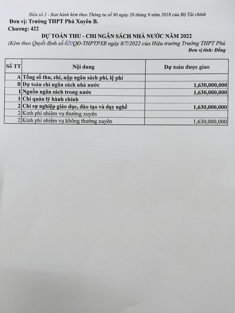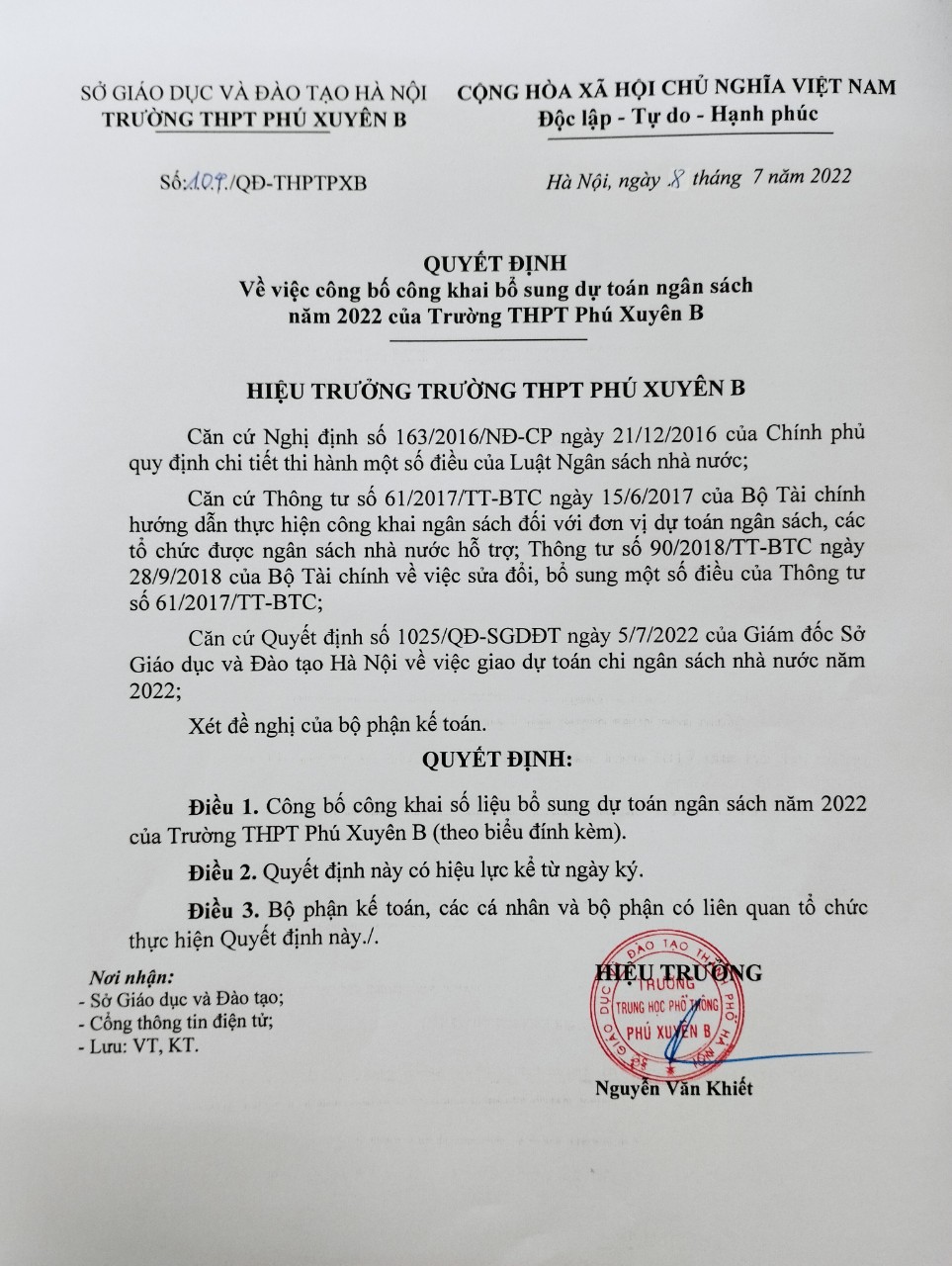 Quyet dinh 104 Cong khai bo sung du toan ngan sach nam 2022 ( thang 10) truong THPT Phu Xuyen B