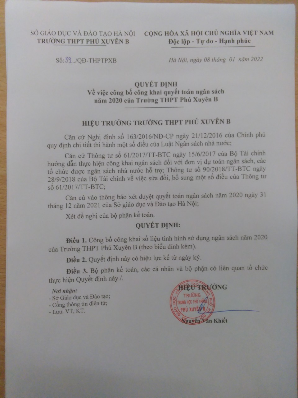 Quyết định 39 công bố công khai quyết toán ngân sách năm 2020