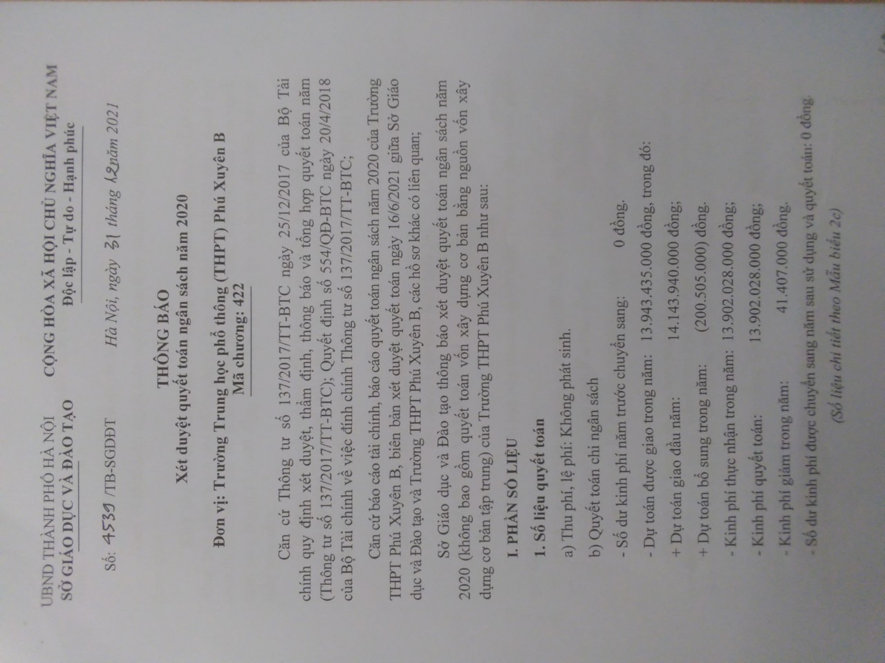 Thông báo  Duyệt quyết toán ngân sách năm 2020 của Sở Giáo dục và Đào Tạo Hà Nội