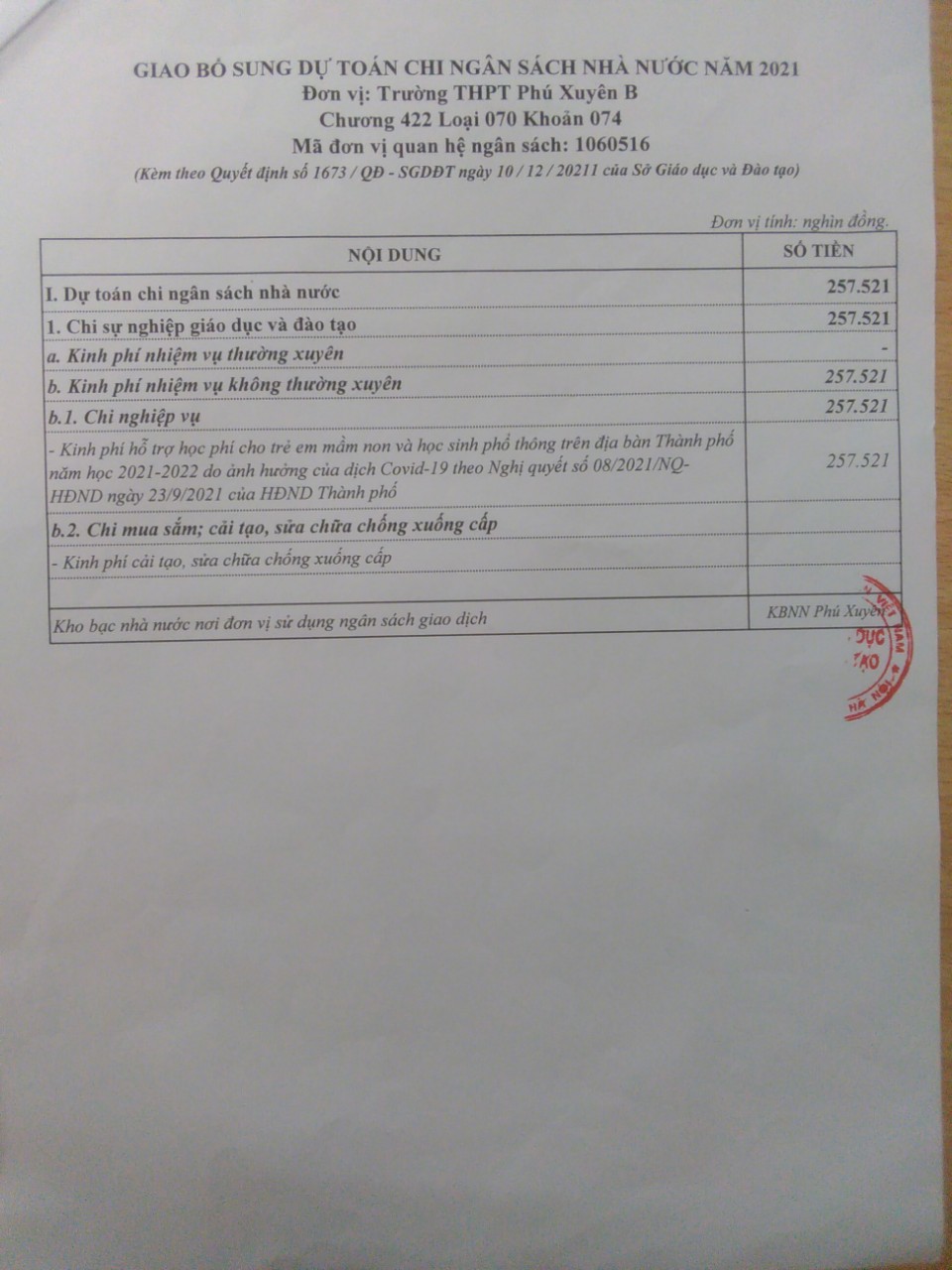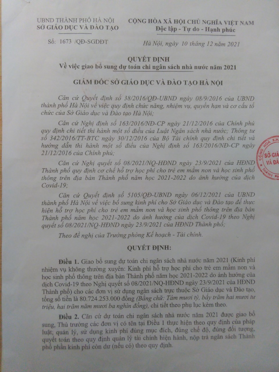 Quyết định 1673 của Sở Giáo dục và Đào tạo Hà Nội về bổ sung dự toán ngân sách năm 2021