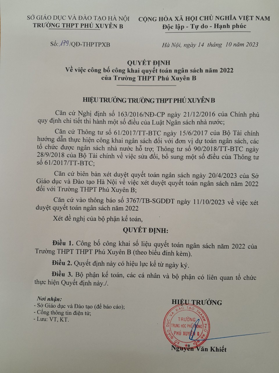 Quyết định công khai quyết toán thu - chi ngân sách nhà nước năm 2022 ; Công khai thực hiện dự toán ngân sách quý 3/2023