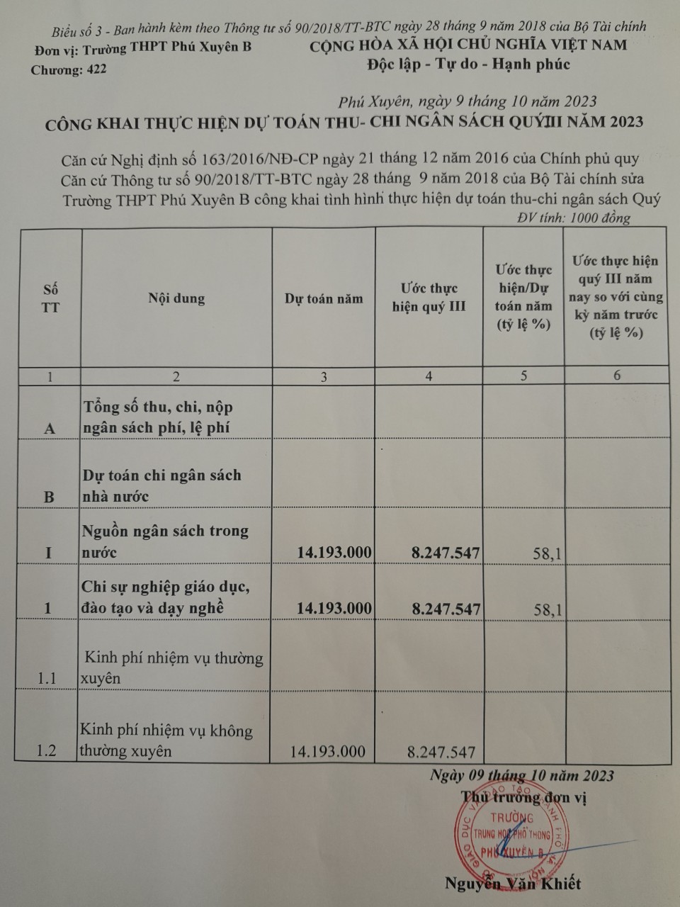 Công khai thực hiện dự toán ngân sách quý 3 / 2023