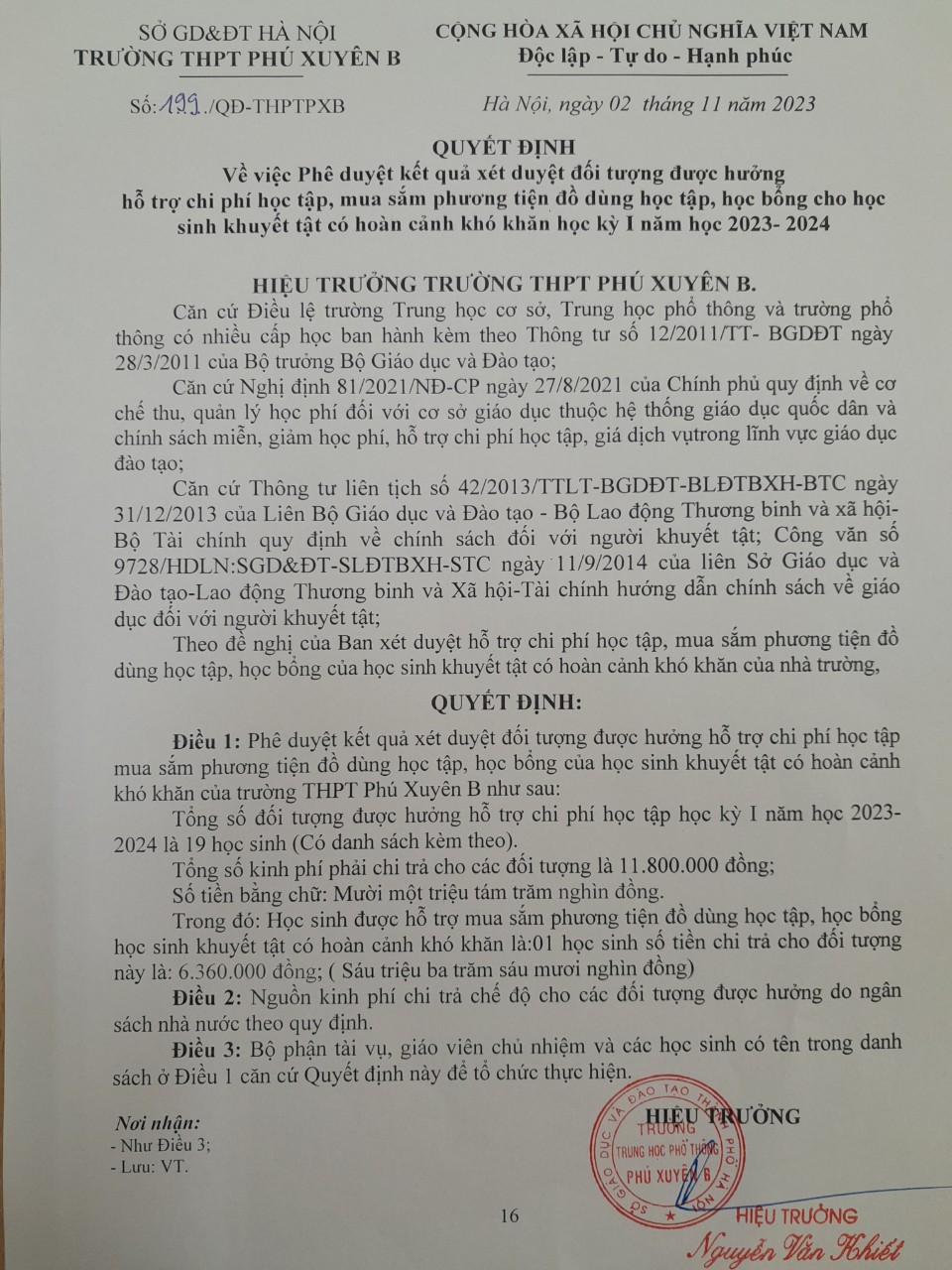 Quyết định phê duyệt kết quả hỗ trợ chi phí học tập, hỗ trợ đồ dùng cho học sinh có hoàn cảnh khó khăn HK I NH 2023-2024
