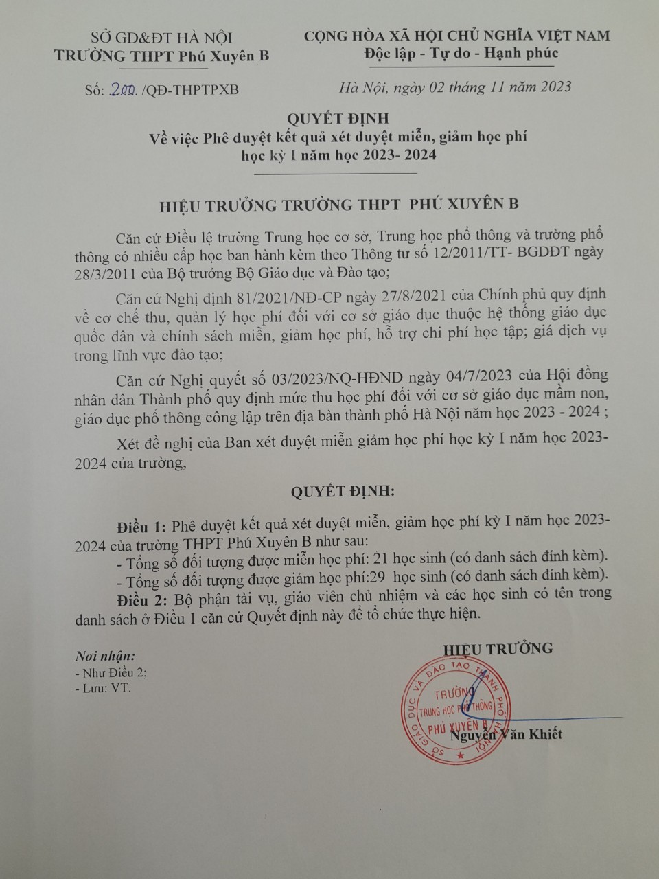 Quyết đinh phê duyệt miễn giảm học phí, QĐ phê duyệt hỗ trợ chi phí học tập, đồ dùng HK I Năm học 2023-2024
