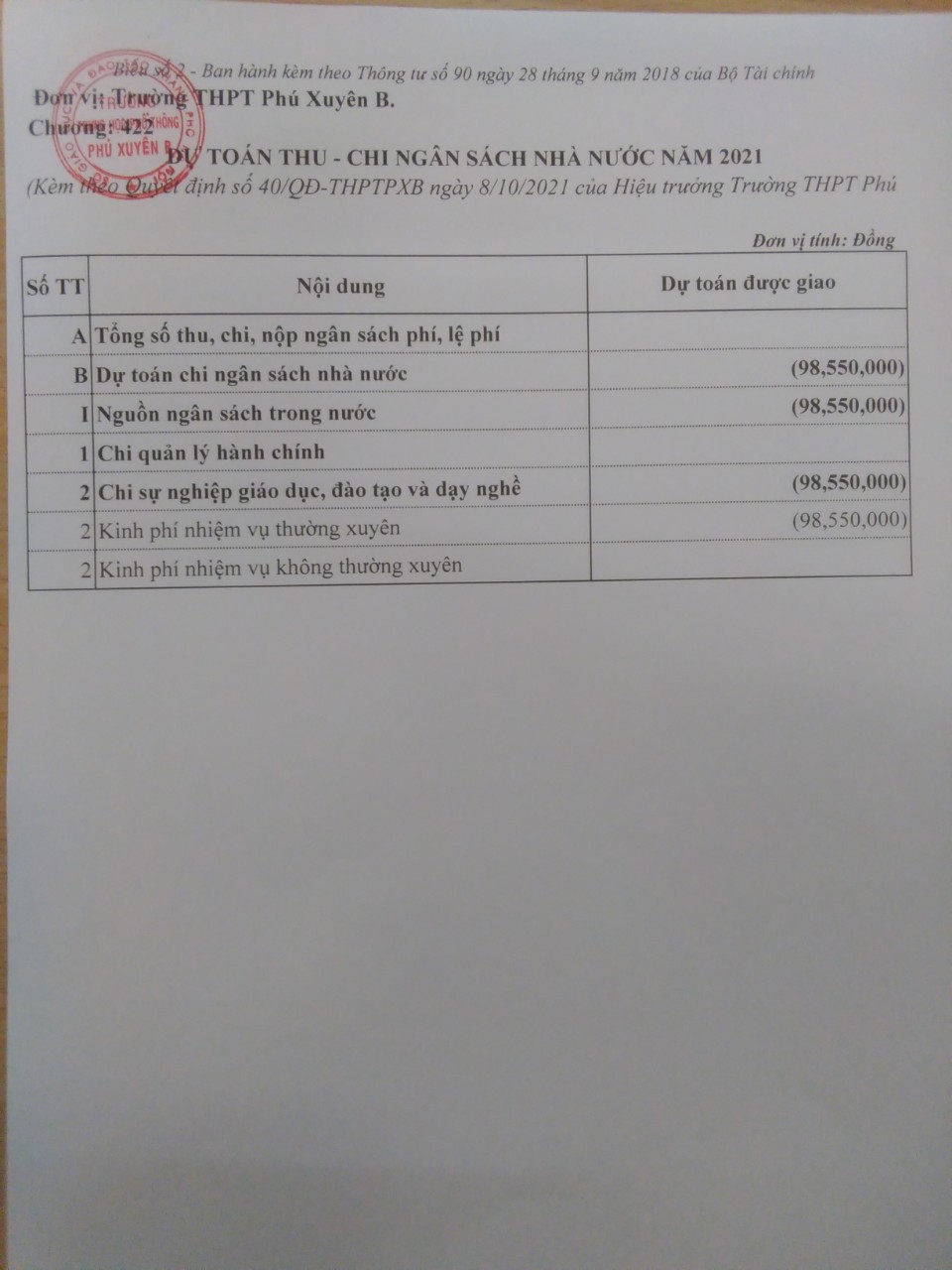Quyết  định số 40 công bố công khai giảm dự toán ngân sách năm 2021 và  biểu dự toán giảm dự toán ngân sách năm 2021