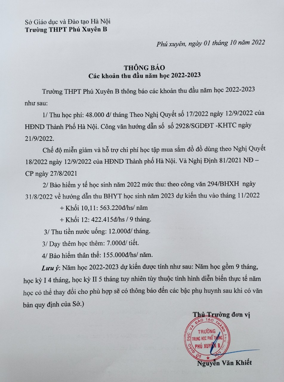 Thông báo các Khoản thu trong năm học 2022 - 2023 của Trường THPT Phú Xuyên B