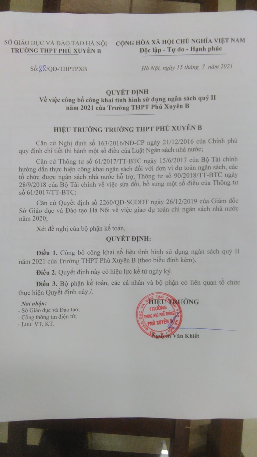 Quyết định công khai tình hình sử dụng ngân sách quý 2 năm 2021 của Trường THPT Phú Xuyên B
