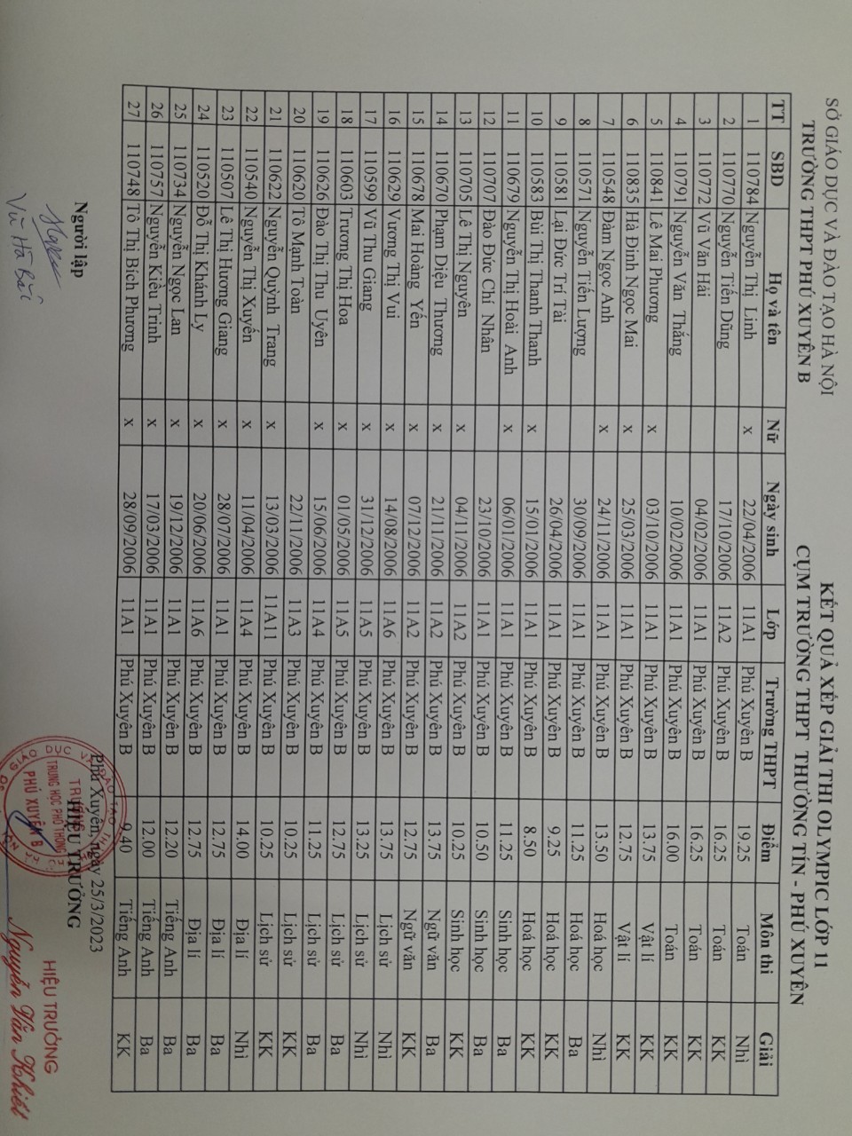 Kết quả thi Olympic học sinh giỏi khối 10, khối 11 cấp cụm Thường Tín - Phú Xuyên năm học 2022- 2023