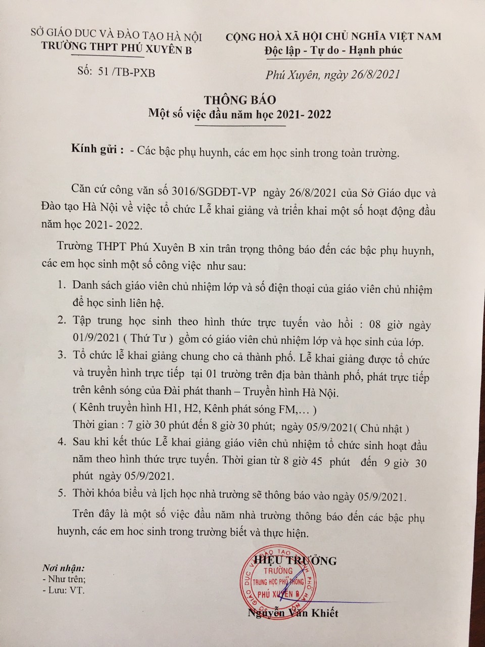 Trường THPT Phú Xuyên B thông báo tới các bậc phụ huynh, các em học sinh trong toàn trường một số công việc đầu năm học 2021 - 2022;