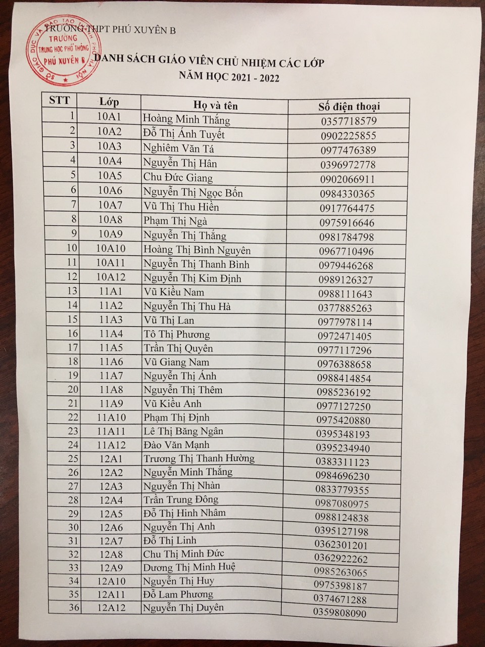và danh sách giáo viên chủ nhiệm lớp kèm số điện thoại để liên hệ.