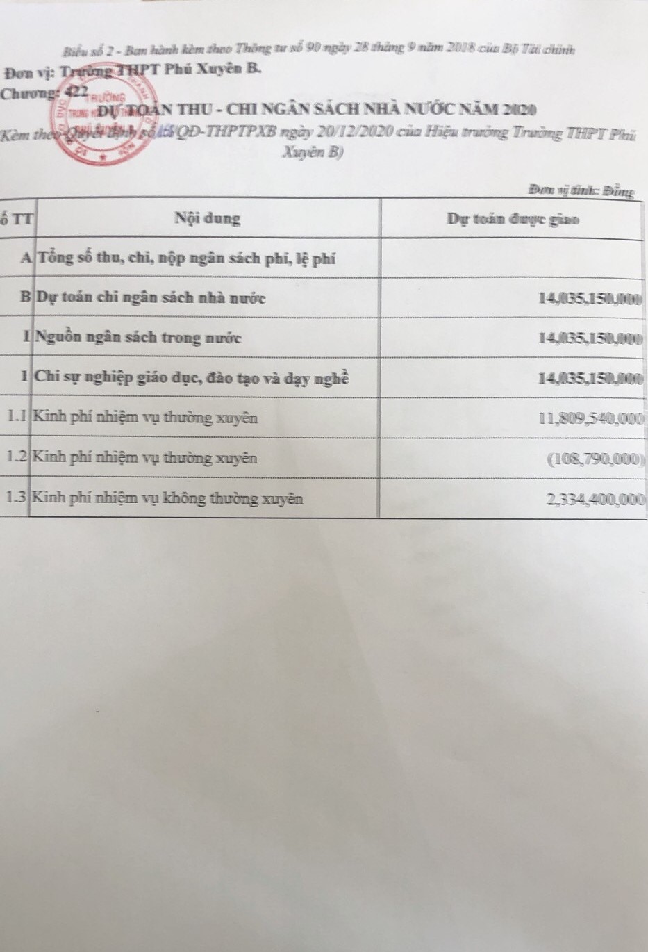 1. Về việc công bố công khai điều chỉnh giảm dự toán ngân sách nhà nước năm 2020 của Trường THPT Phú Xuyên B